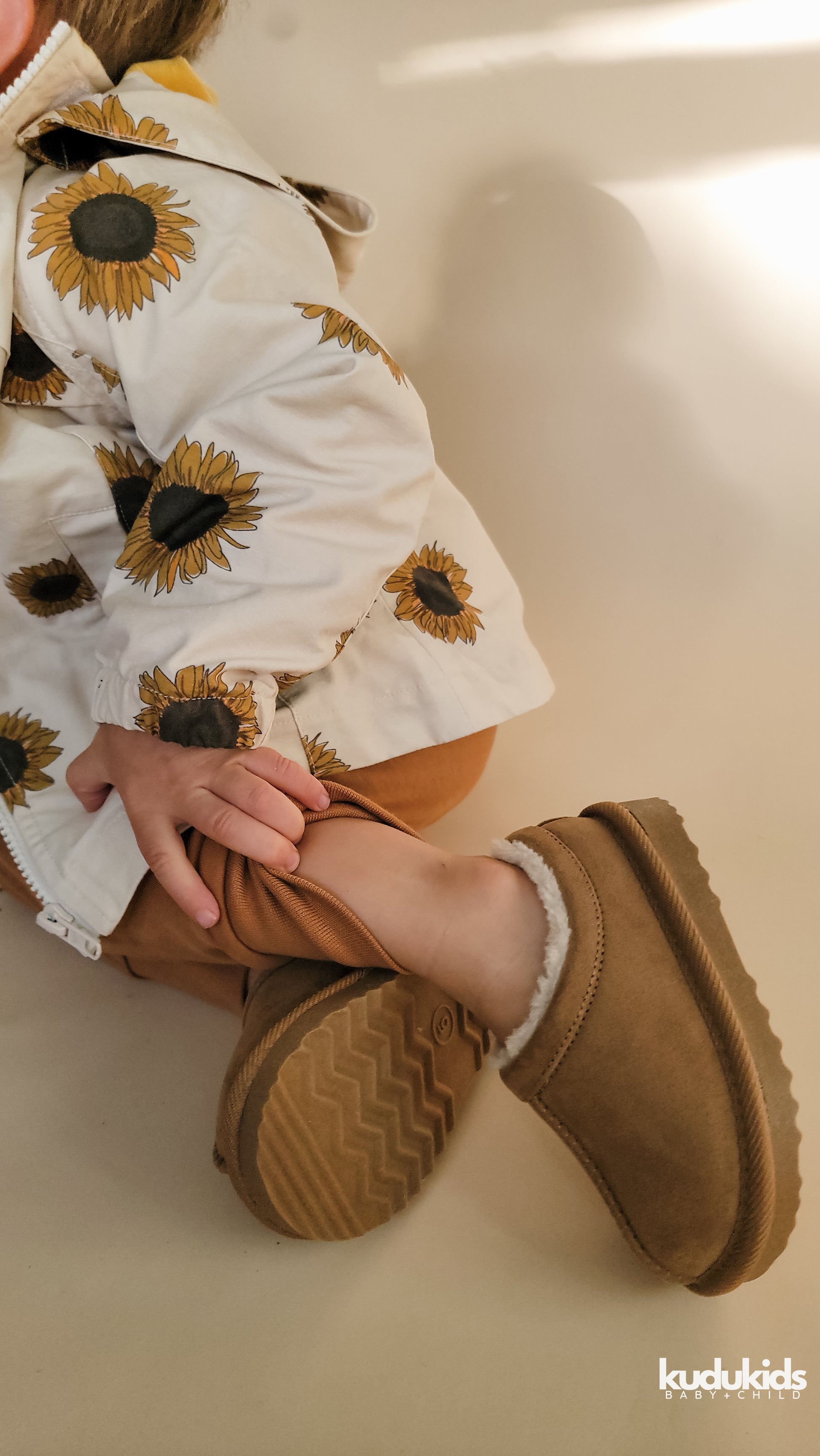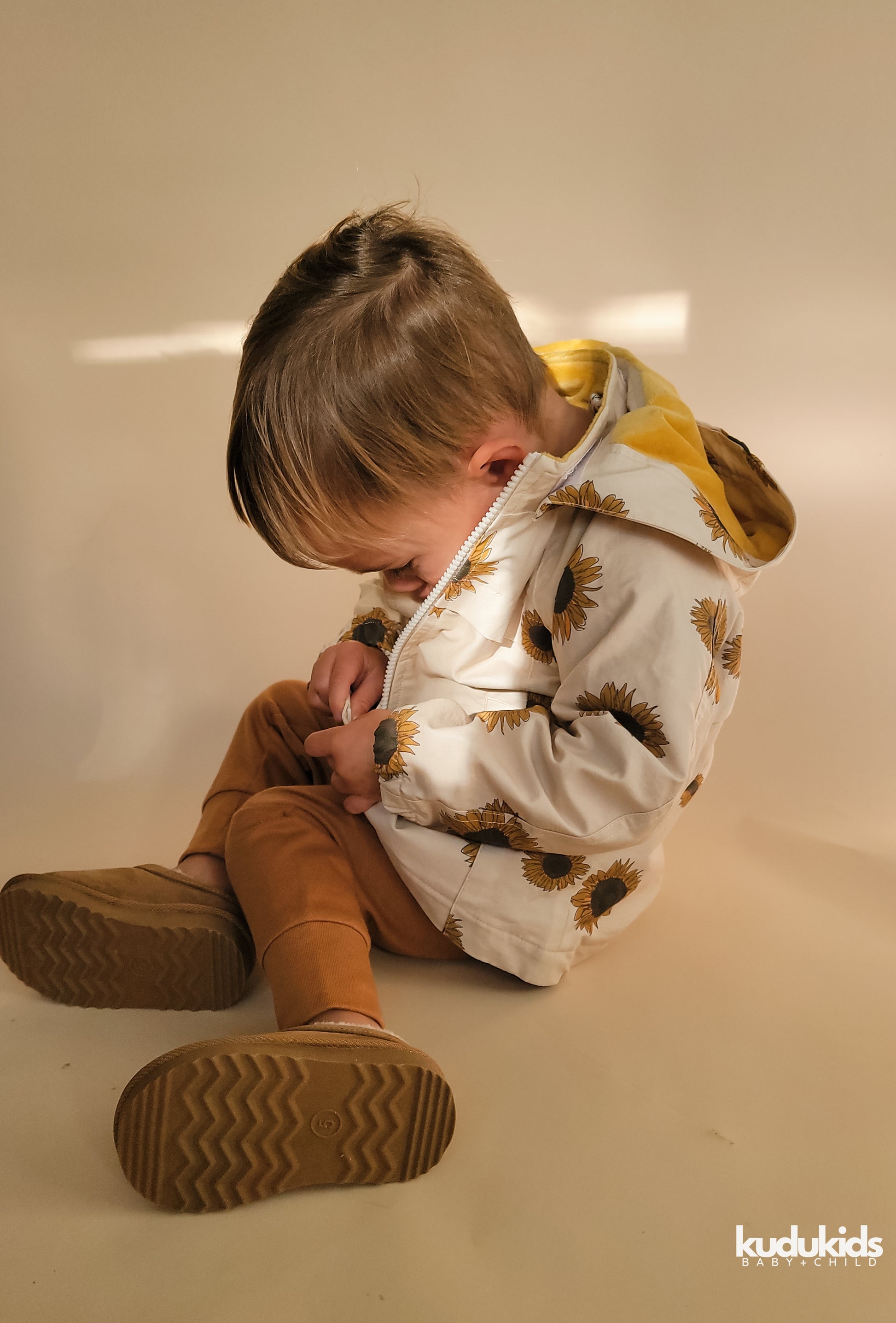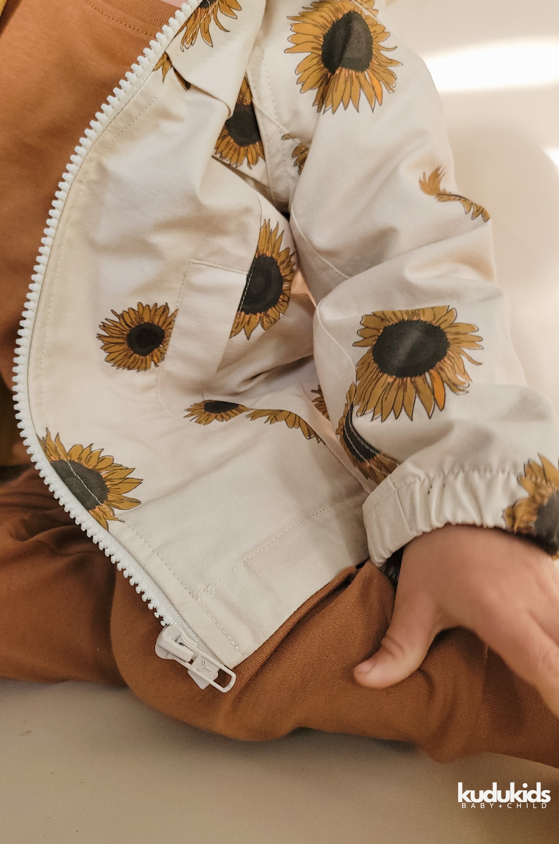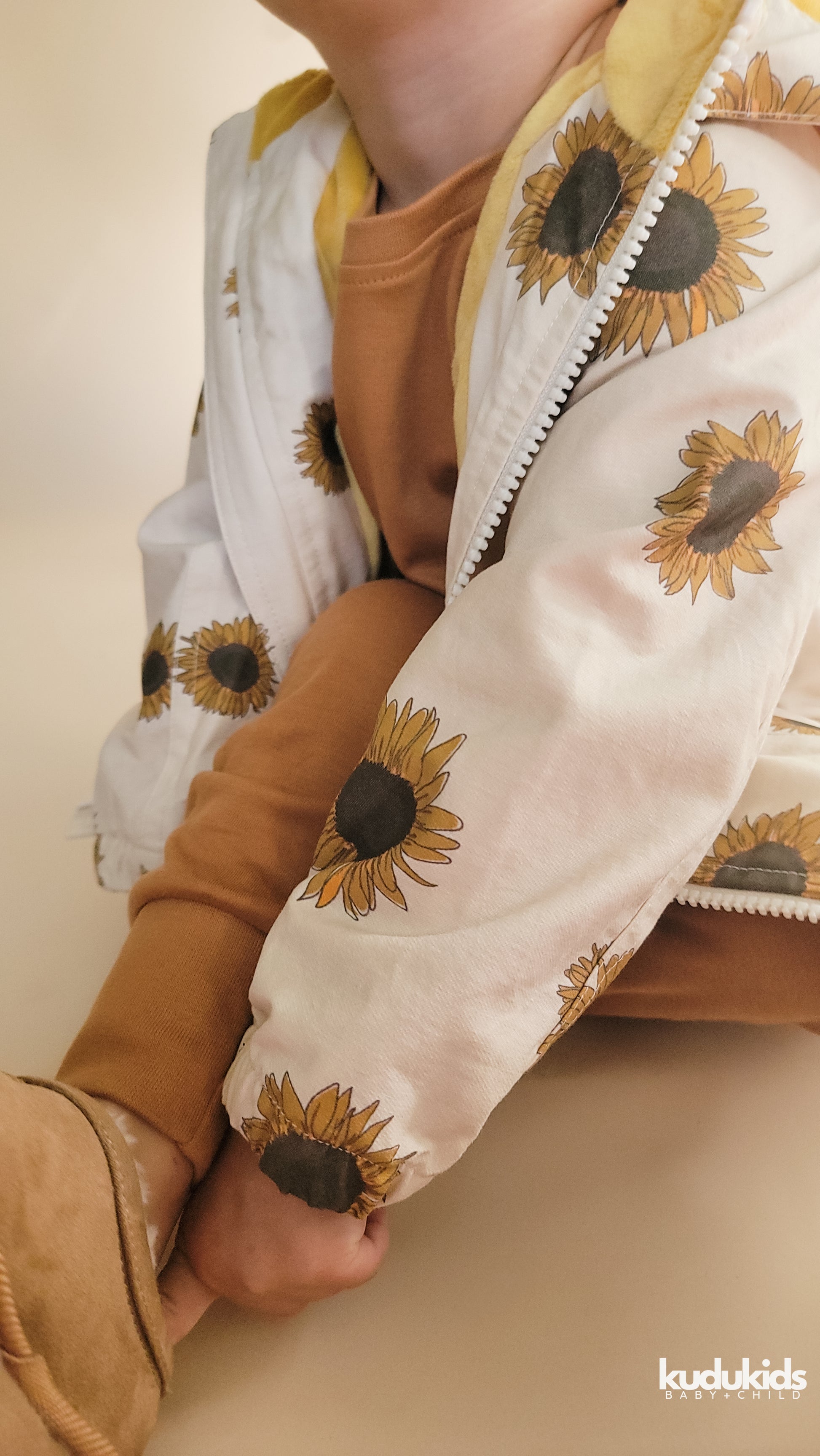 You need this cotton Sunflower jacket! It's lightweight, durable and versatile! With two side functional pockets, a detachable hood and entirely fleece lined to keep your KUDU warm in the cool fall weather!