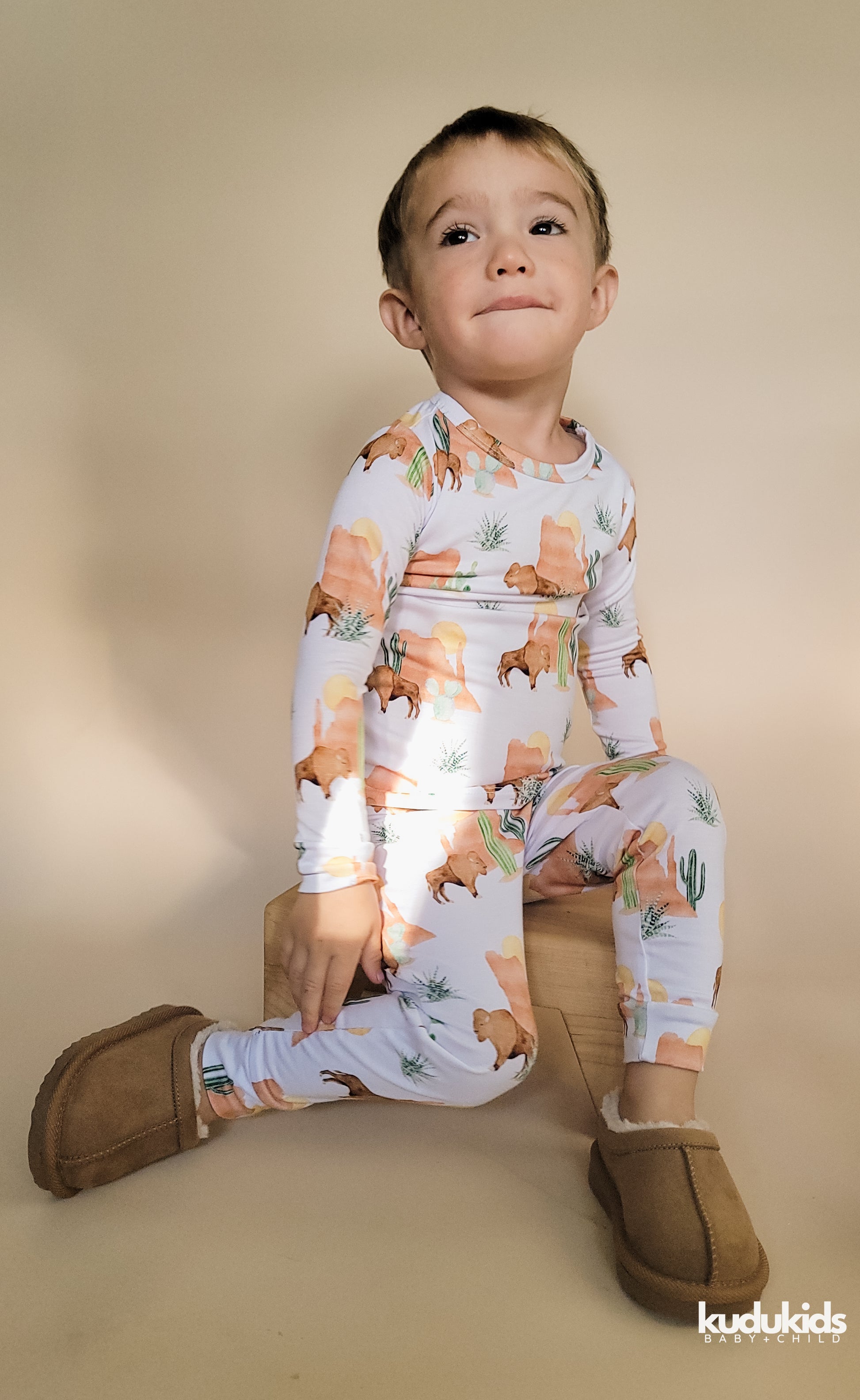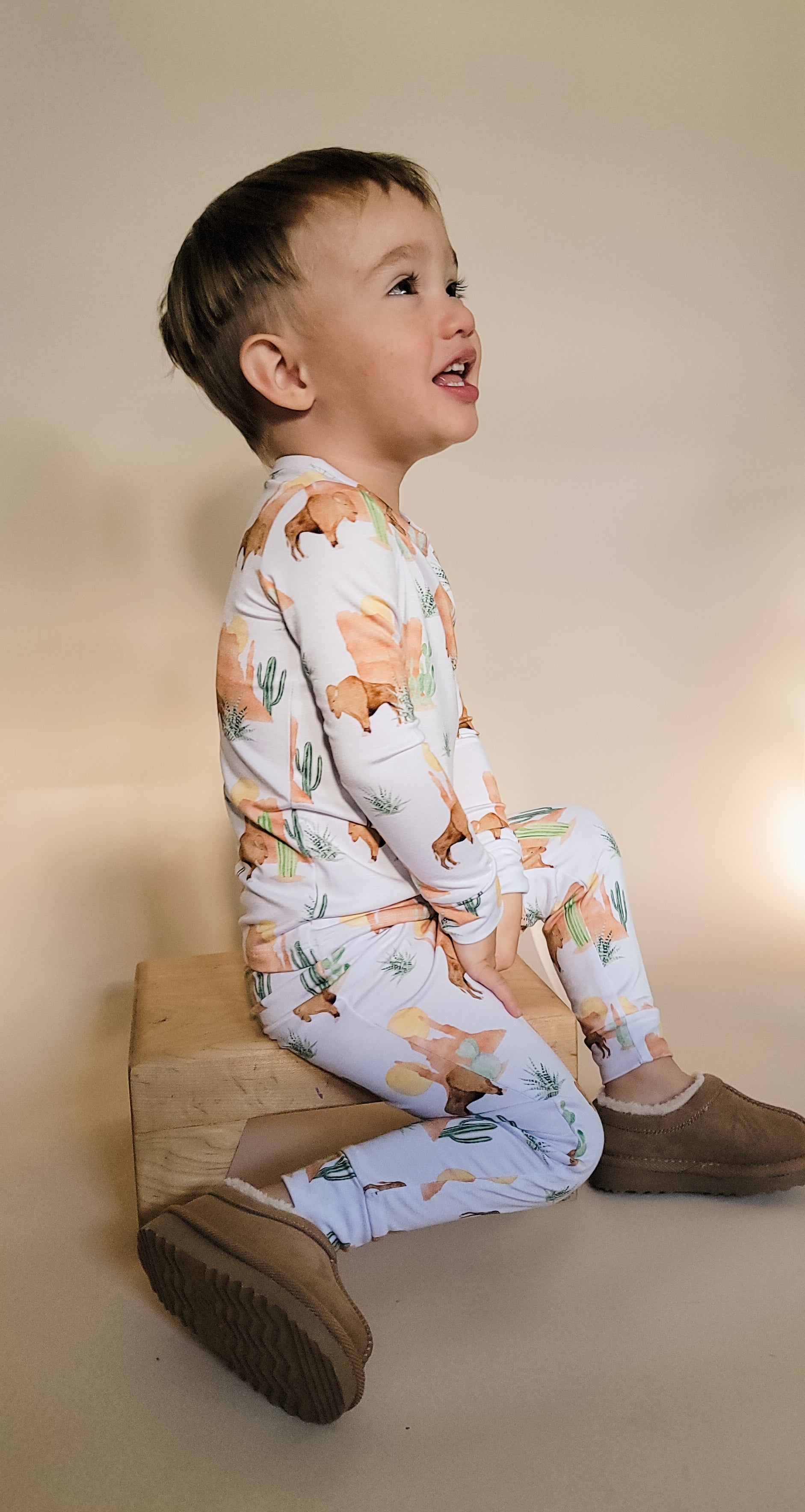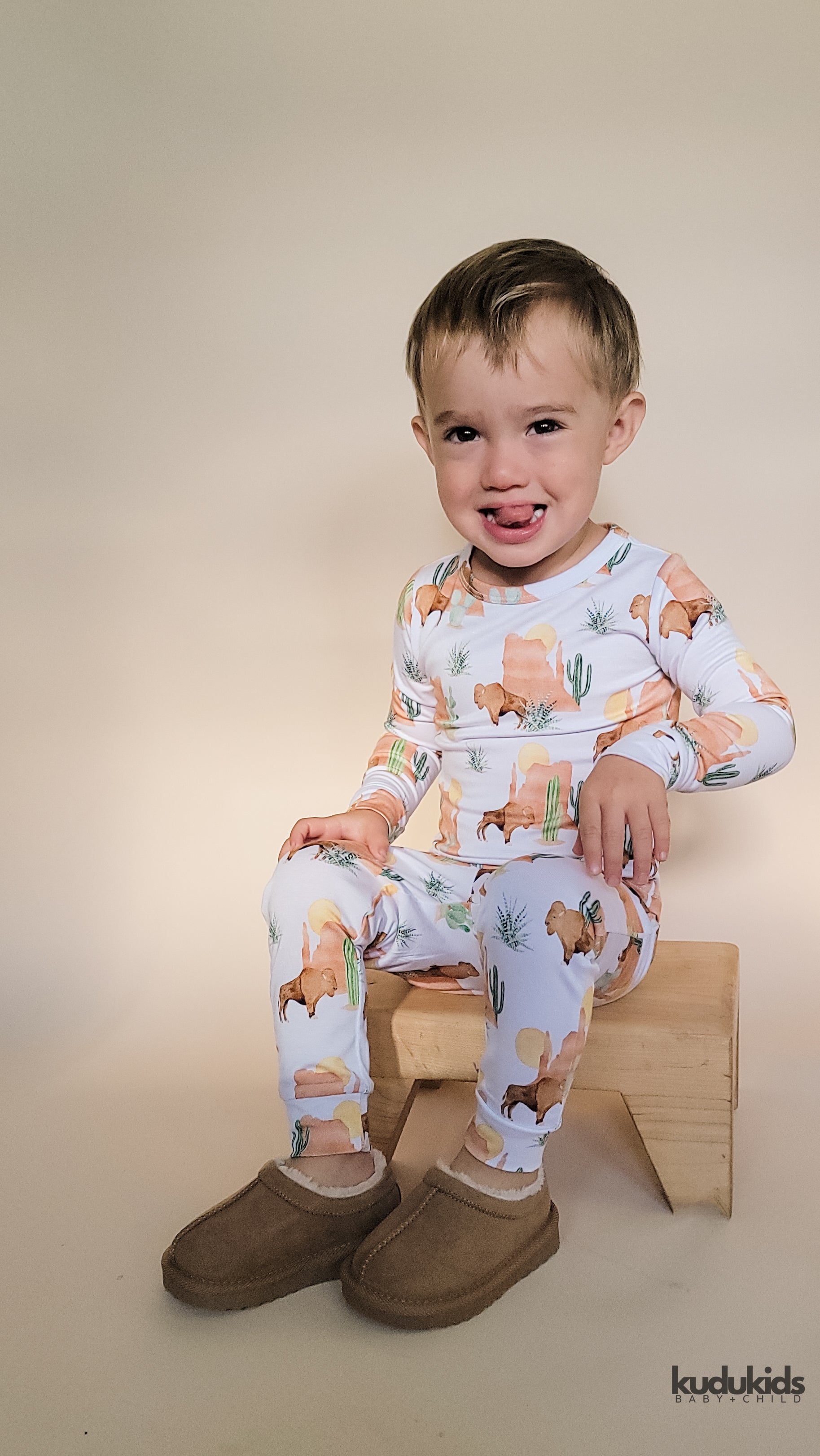 Made for your western wearing Kudu! These 2-piece Bamboo Bison Pajamas are made from a buttery soft bamboo/spandex blend with the perfect amount of stretch and softness!