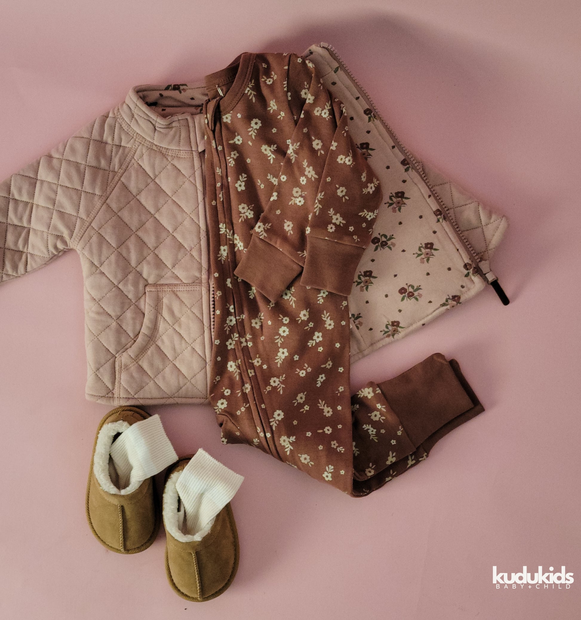 This lovely romper includes convertible footies and mittens and double zipper for easy of use. Pair alone, or with our matching quilted cotton jacket in rose!