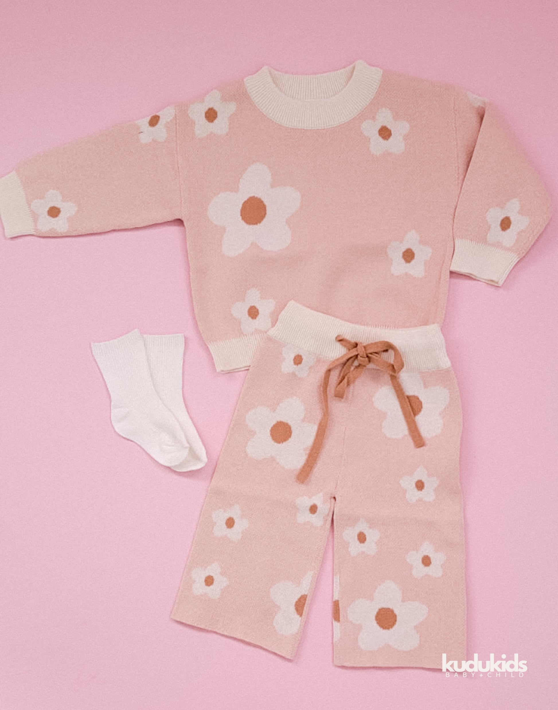 Bring a touch of retro charm to your baby’s wardrobe with these Organic Cotton Daisy Flares in a sweet peach hue. Featuring playful daisy prints and a soft, stretchy waistband, these flared pants are perfect for both cozy lounging and picture-worthy outings.